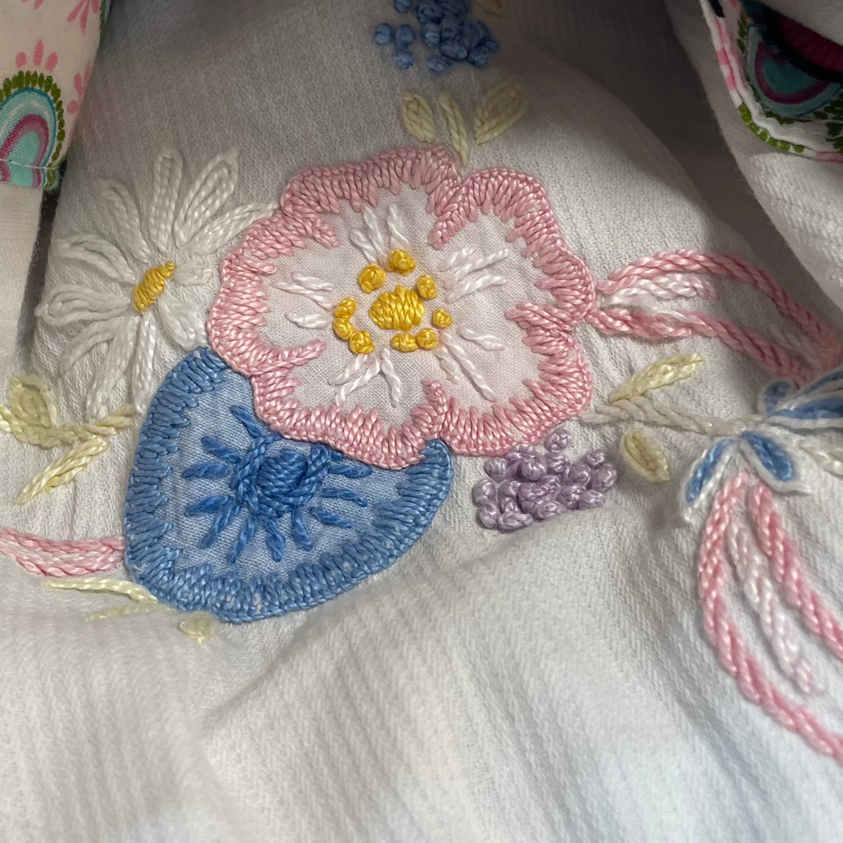 - Interior lining is a portion of a vintage hand embroidered tablecloth.
