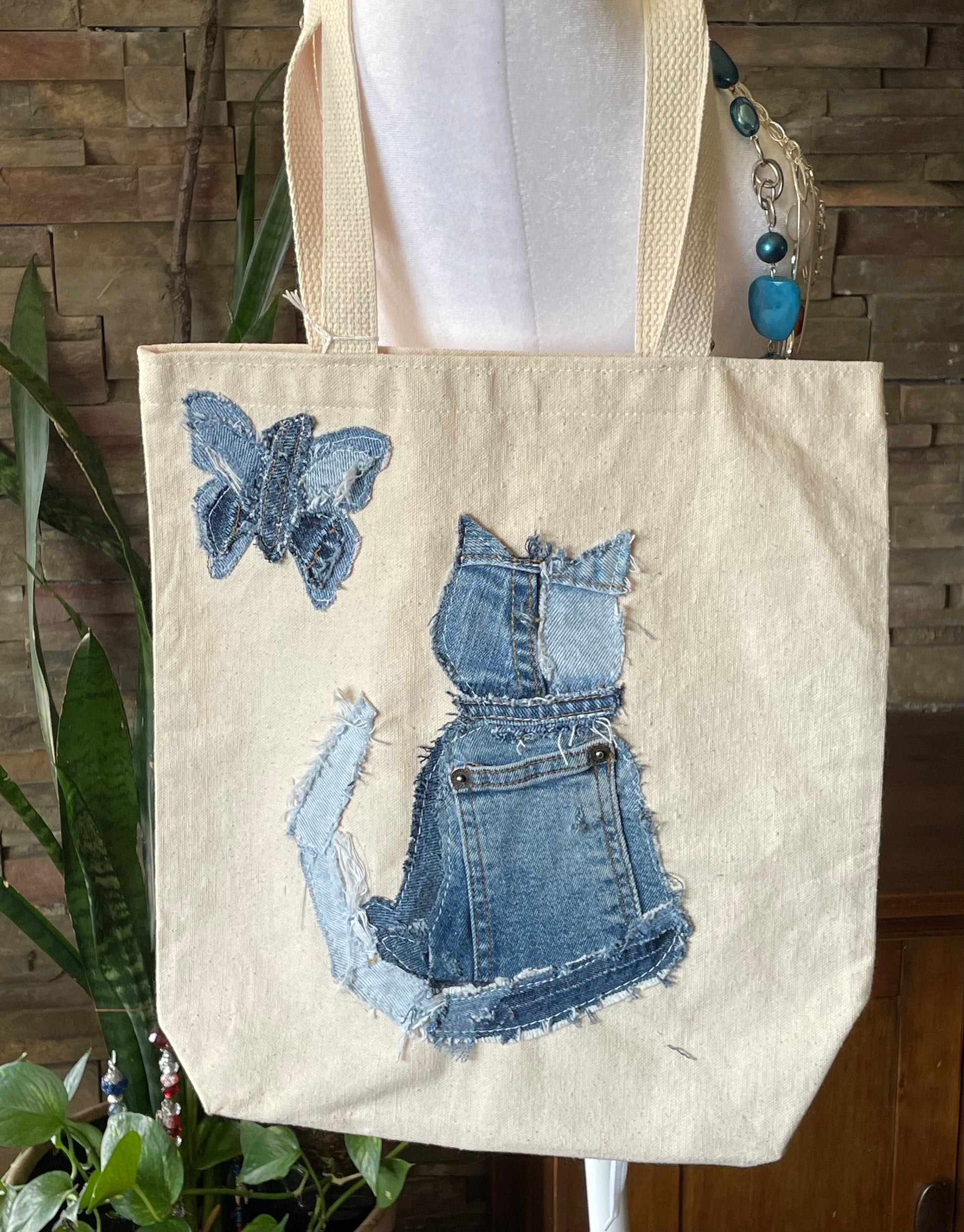 - This tote has hand-cut denim and hand stitched denim pieces featuring a playful cat and butterfly design on a canvas tote.