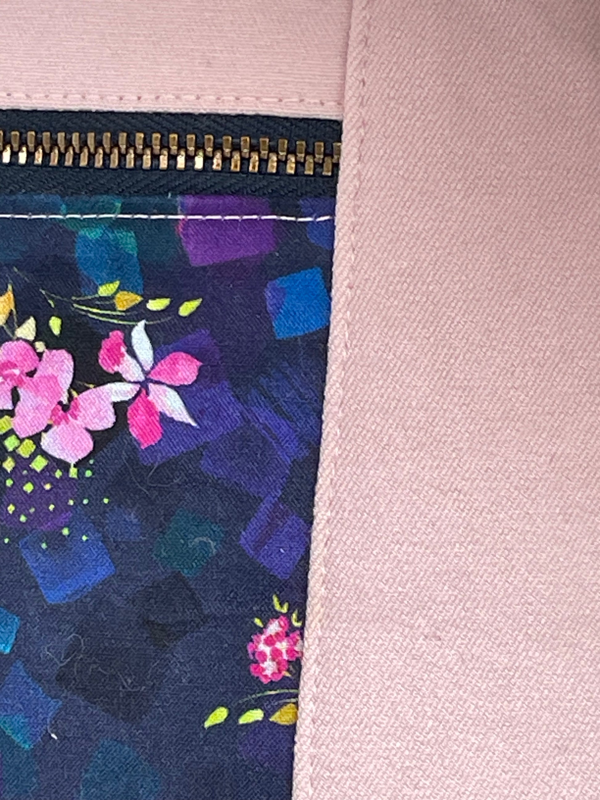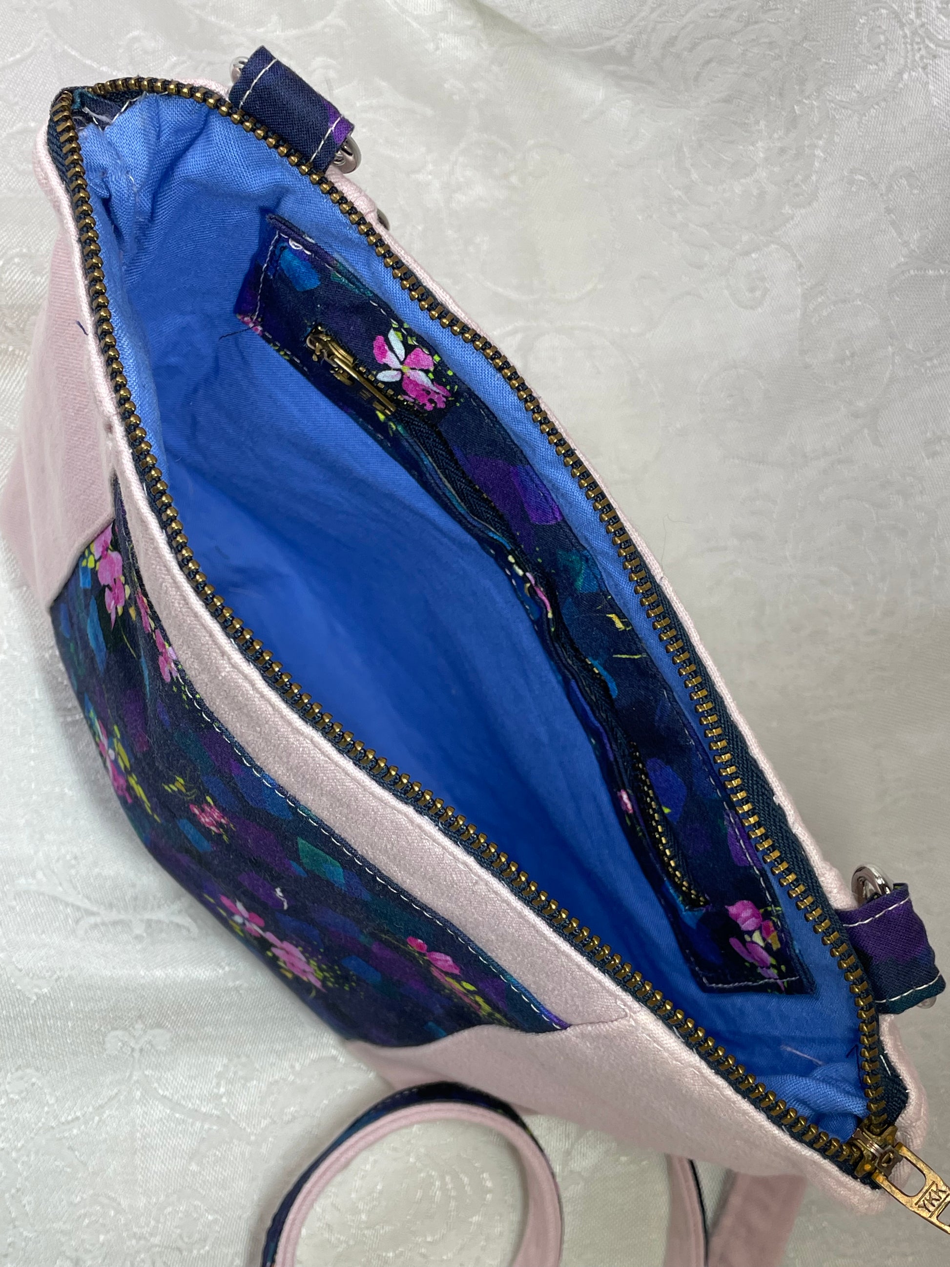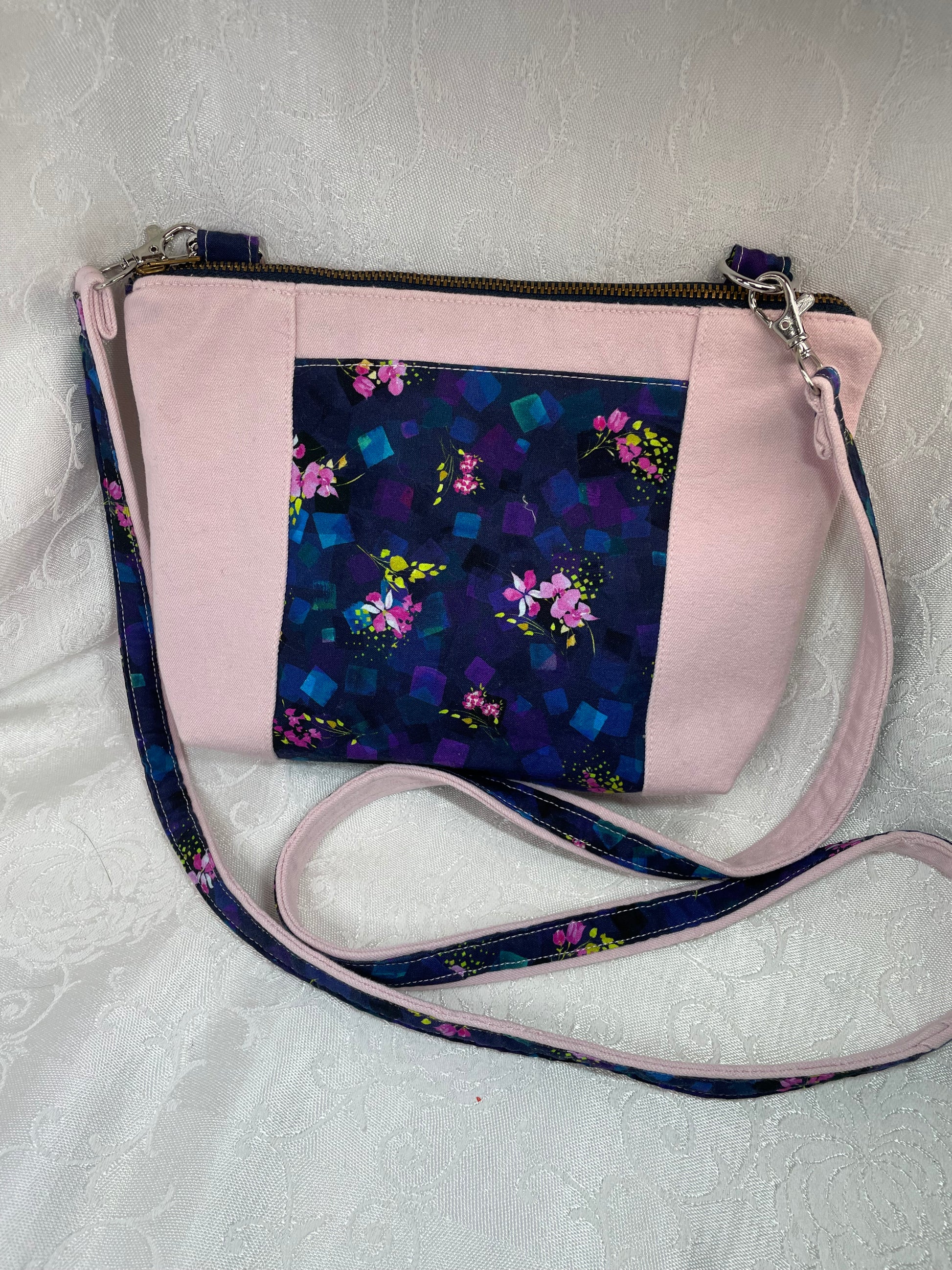 - This handmade Crossbody Purse features a stunning dusty rose main body with a colorful floral and geometric design accent panel.