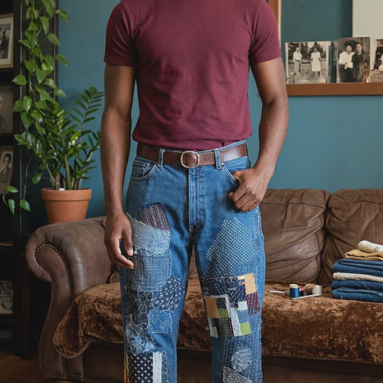 Reclaimed Levi's denim jeans reimagined with traditional Sashiko stitching ad boro-syle patchwork. Each pair is hand -stitched and one of a kind. The photo is a sample as it has already been claimed.