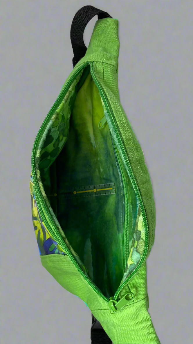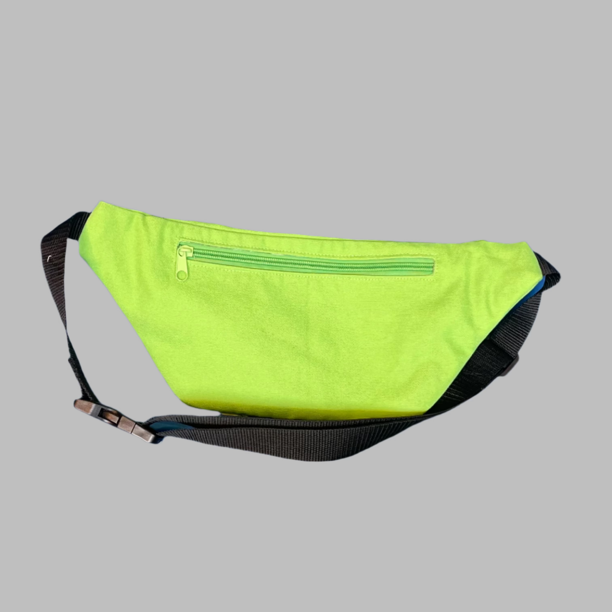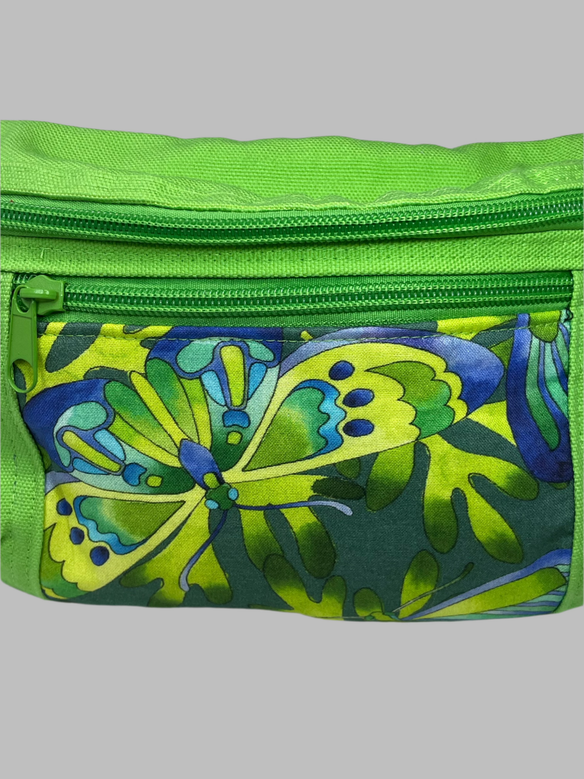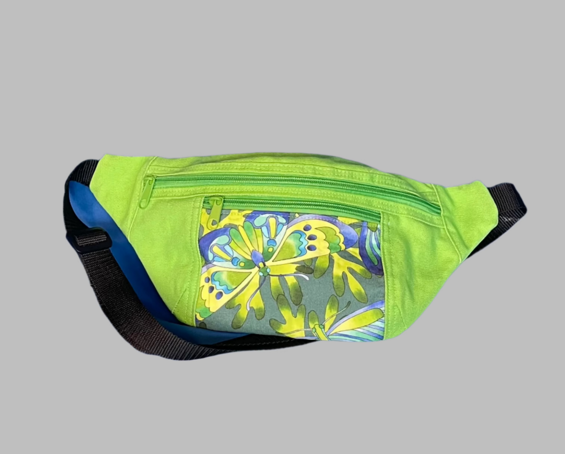 - This unique Bum/Sling Bag is made from reclaimed bright lime green cotton canvas, adorned with blue and green butterflies inset.