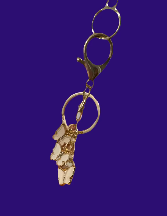 - A gold butterfly bag charm adds a whimsical finishing touch.
