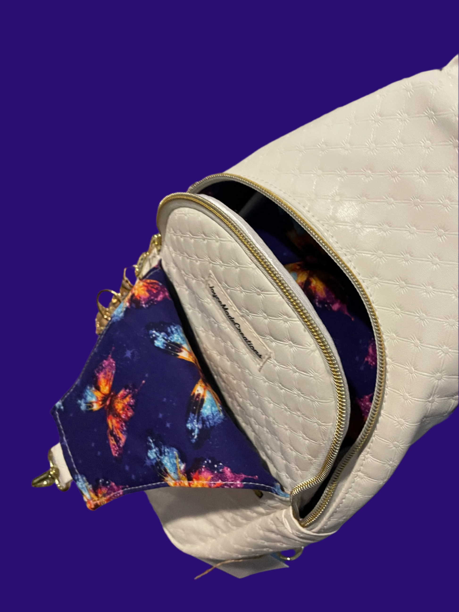 - This dreamy sling bag features quilted diamond-embossed white faux leather with charming gold butterfly zipper pulls and accents.