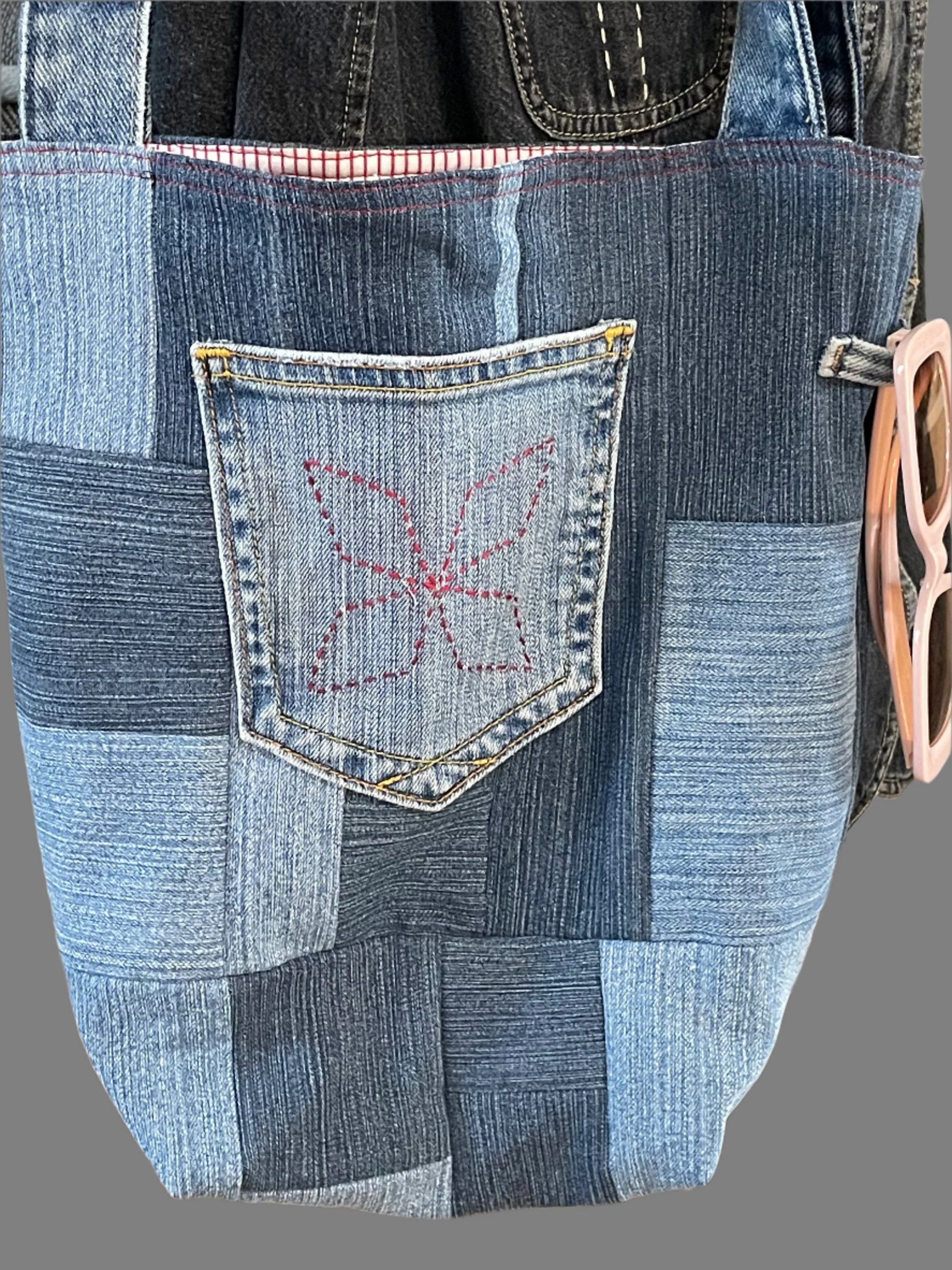 - The reverse side boasts an upcycled jeans pocket and patch work denim.