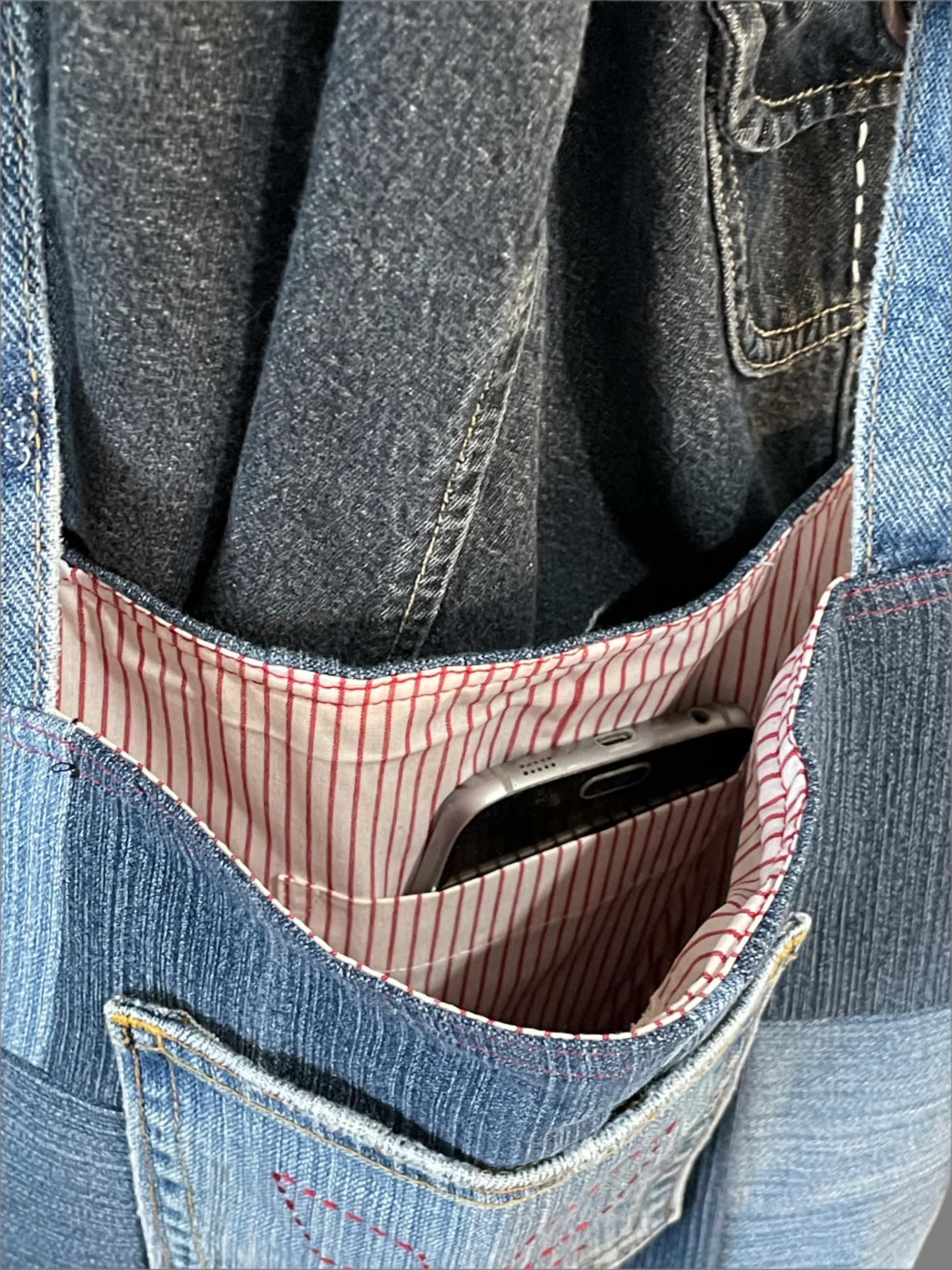 - This handmade Artisan bag is crafted from reclaimed denim.